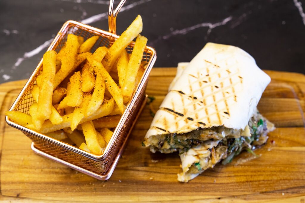 100% Lamb or Chicken Donner, Swiss Cheese, Grilled Mushrooms, Grilled Onion, Tangy Sauce, Ketchup, Salad