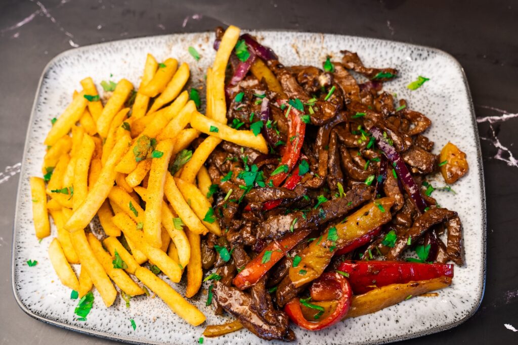 Beef Sizzler Served With American Cheese, Sweet Chili, Caramelised Onion & Fresh Tomatoes