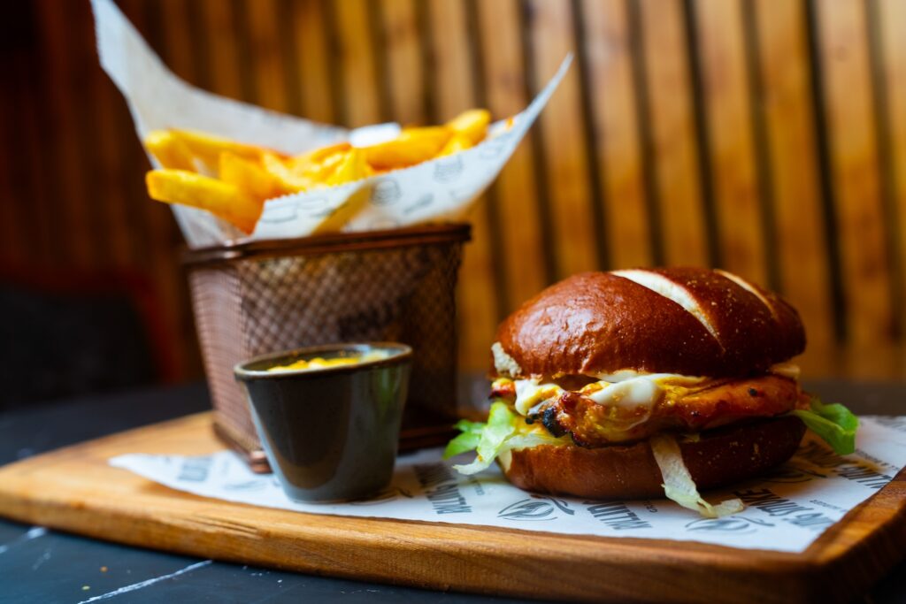 Gourmet Beet And Fried Buttermilk Chicken With Cheese, Relish, Caramelised Onion, Lettuce & Mayo