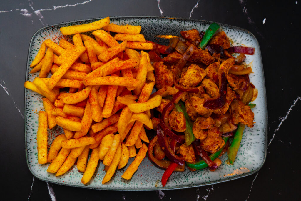 Thinly cut strips of beef or chicken lightly spiced cooked on the griddle with onions, peppers, served with chips, rice or naan